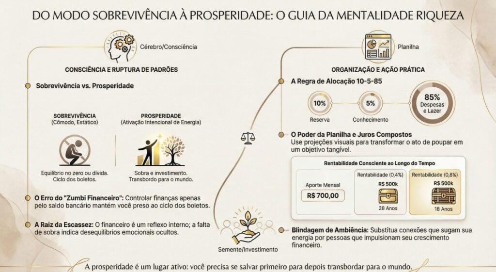 O infográfico apresenta algo essencial: para sair do modo sobrevivência é necessário consciência, ruptura de padrões e organização prática.