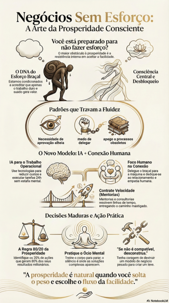 Quando falamos em Negócios Sem Esforço, não estamos falando de passividade. Estamos falando de maturidade estrutural. Estamos falando de decisões conscientes que reduzem fricção, alinham energia e multiplicam resultados com inteligência.